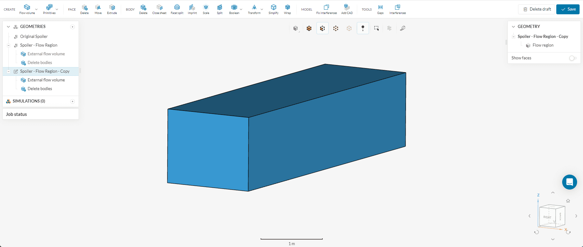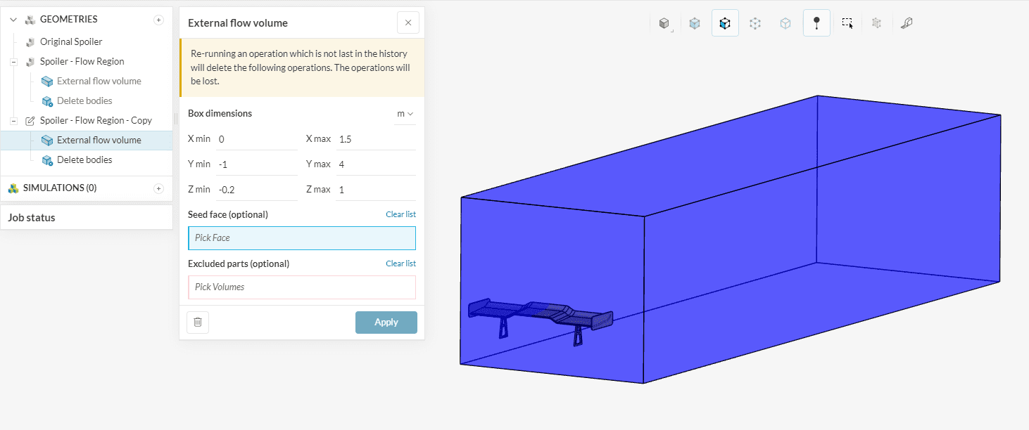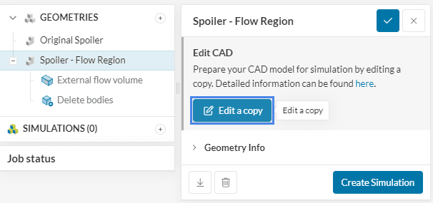 You can check the details of the flow volume creation by selecting the Spoiler – Flow Region geometrical object item on the left, and clicking the ‘Edit a copy’ icon: