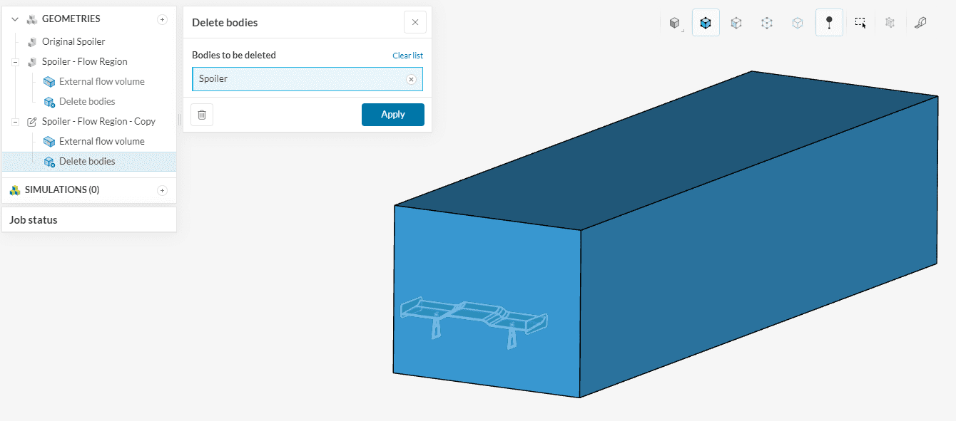 As this is an incompressible analysis, only the flow volume is necessary to run the simulation. Therefore, the spoiler volume is deleted with the operation below: