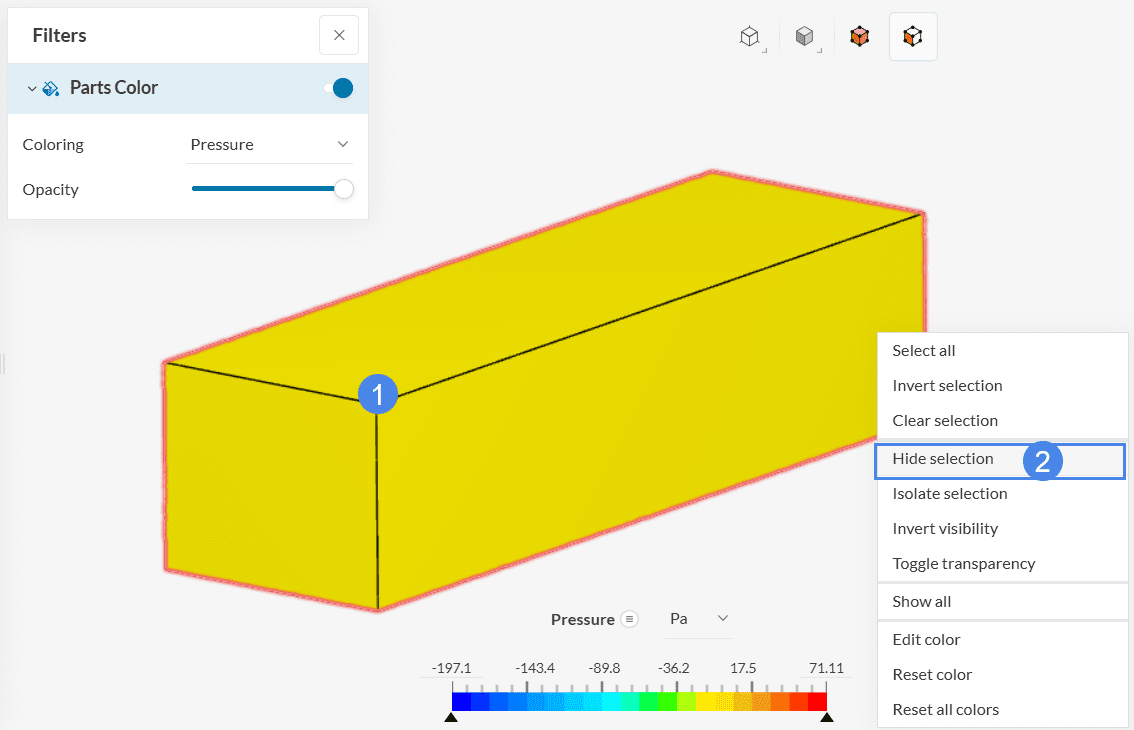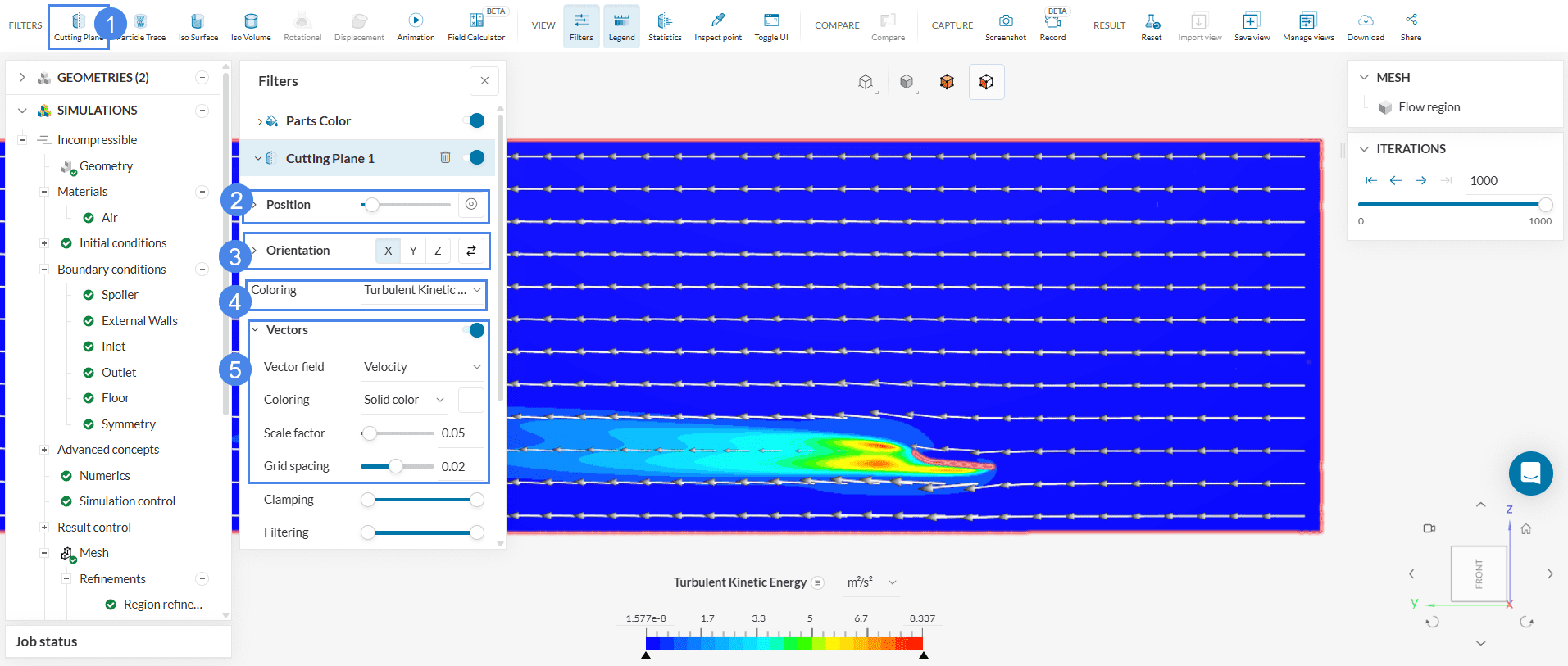 A cutting plane can also be used to better understand the turbulence around the spoiler and its characteristics. To create a cutting plane, select ‘Cutting plane’ from the Filters panel.