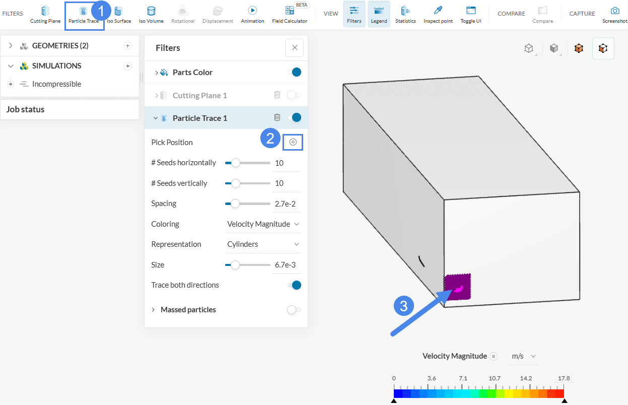 At this point, you can configure your particle traces so that the streamlines show relevant pictures. Change the number of particle traces by changing the values in #Seeds horizontally to ’50’ and #Seeds vertically to ‘8’. Change the Spacing to ‘1e-2’ and the Size to ‘1e-3’. Hide the walls of the fluid domain to see the streamlines around the spoiler. Finally, change the Coloring in Parts color to some contrasting white or grey solid color.