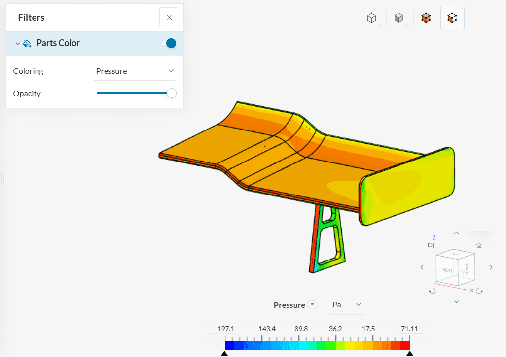 You can visualize your results by using SimScale’s online post-processor. We will visualize the pressure distribution on the spoiler, create a cutting plane, and animate the streamlines of the flow around the spoiler.