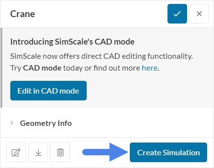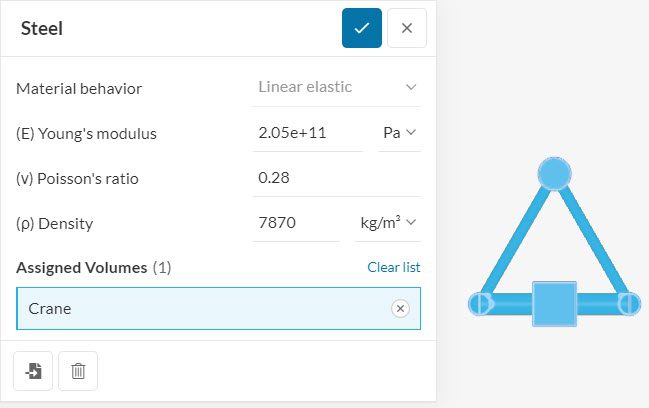 Since this geometry contains a single volume, the crane is automatically assigned to the material. You can proceed by clicking on the check icon to save. It is worth noting that you can define a custom material by changing the material properties, and it’s also possible to give a new name to your material.