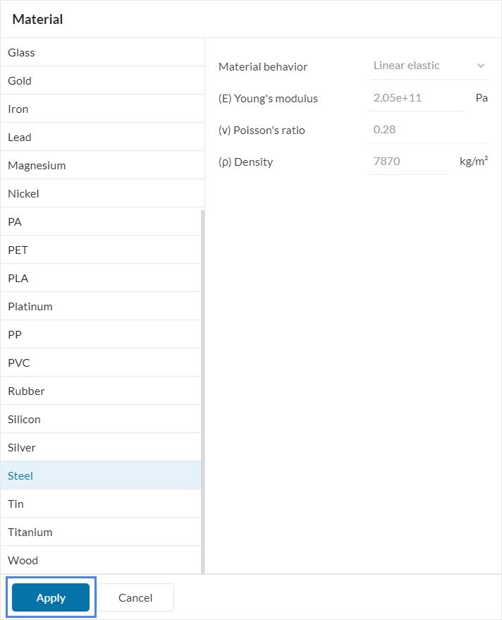 For this simulation, please select ‘Steel’ and confirm by pressing ‘Apply’.