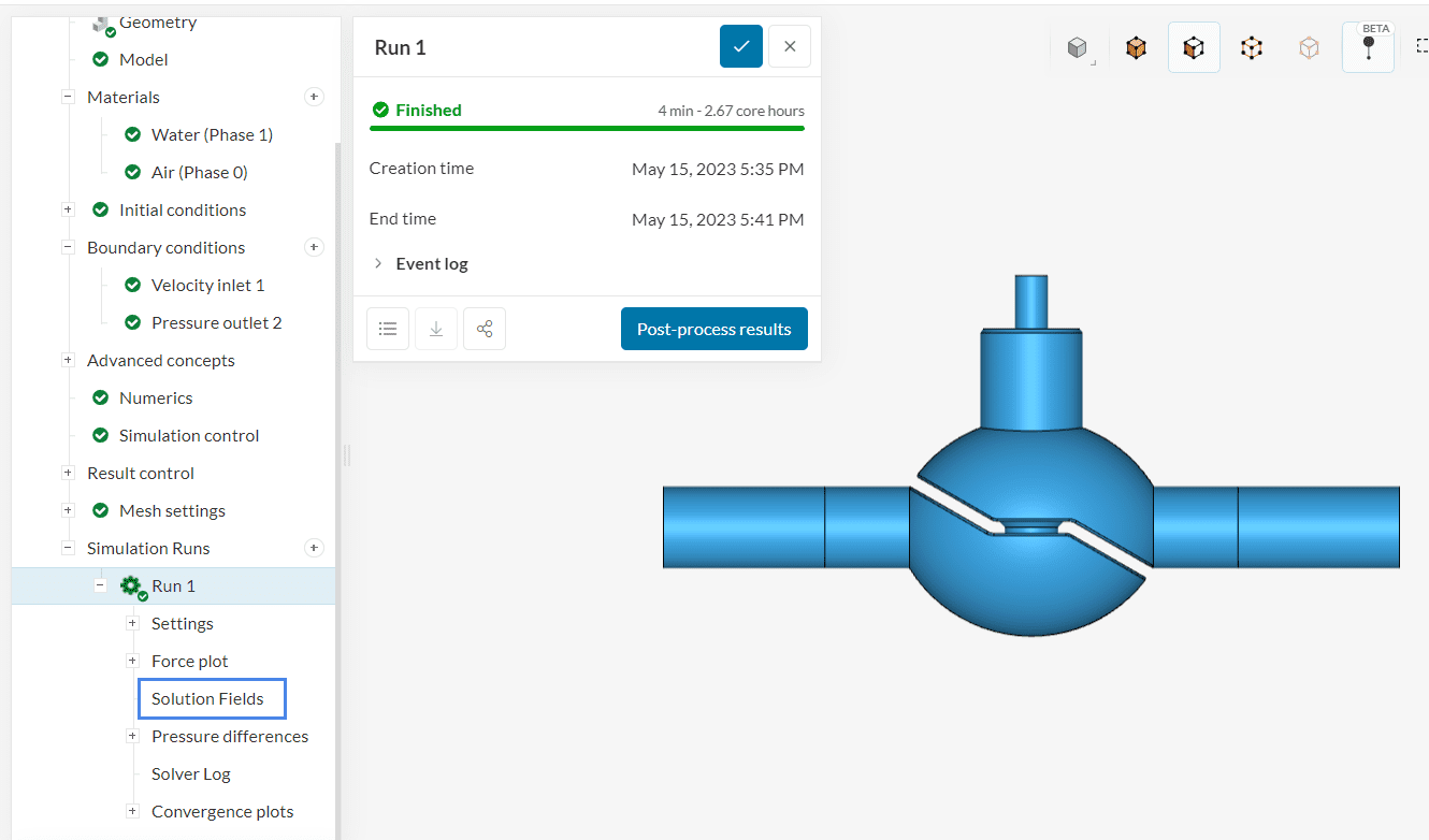 While the results are being calculated you can already have a look at the intermediate results in the post-processor by clicking on ‘Solution Fields’ or ‘Post-process results’. They are being updated in real-time!