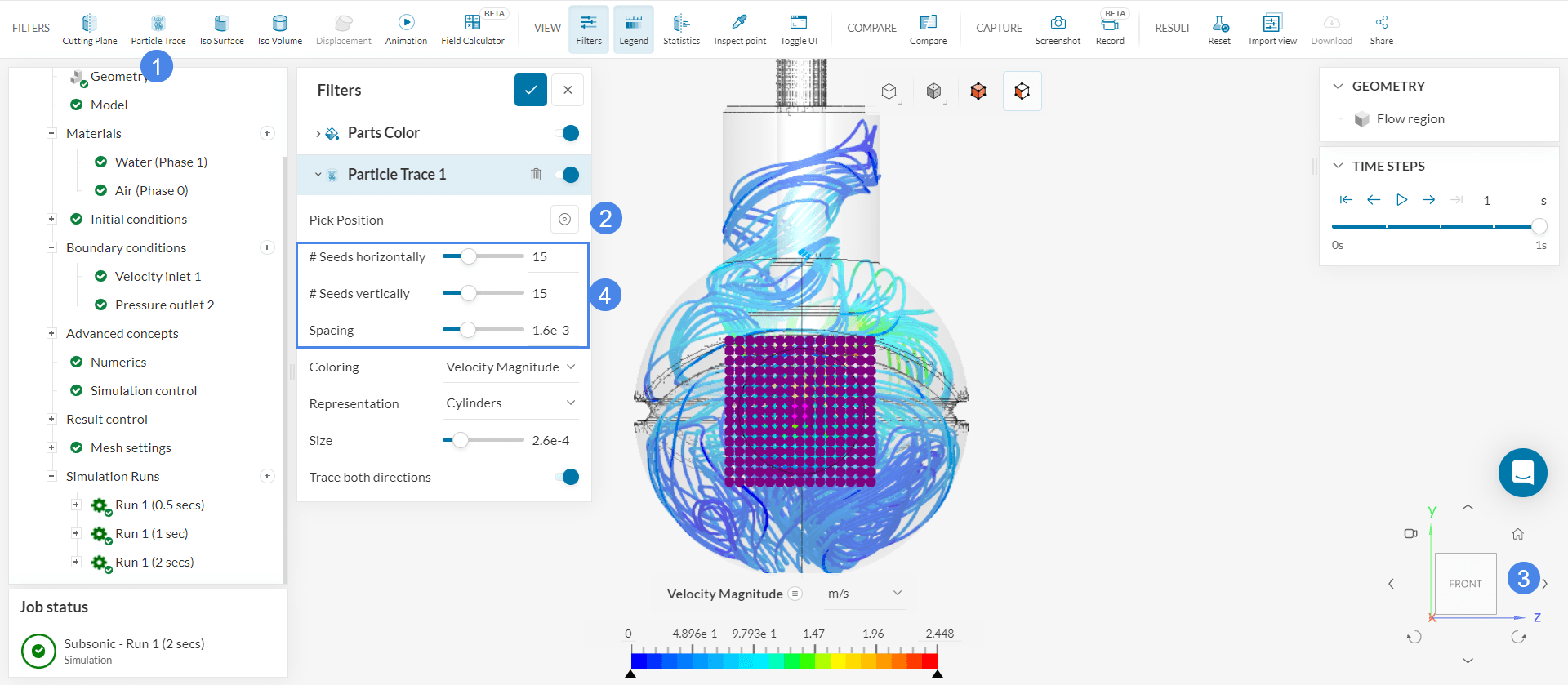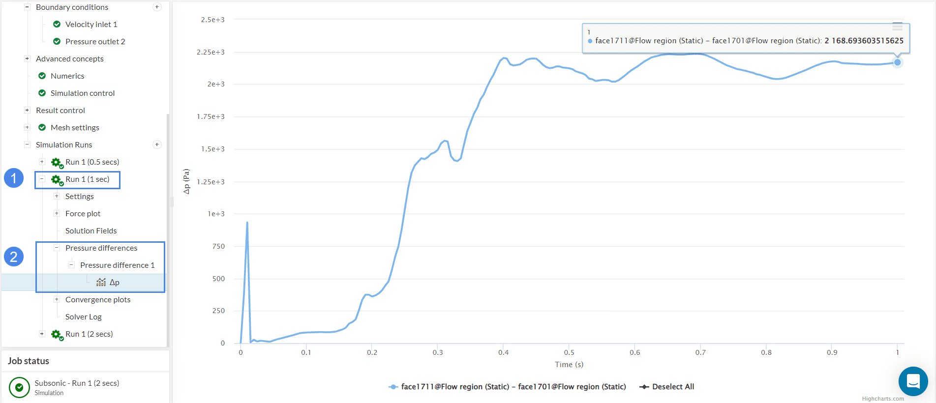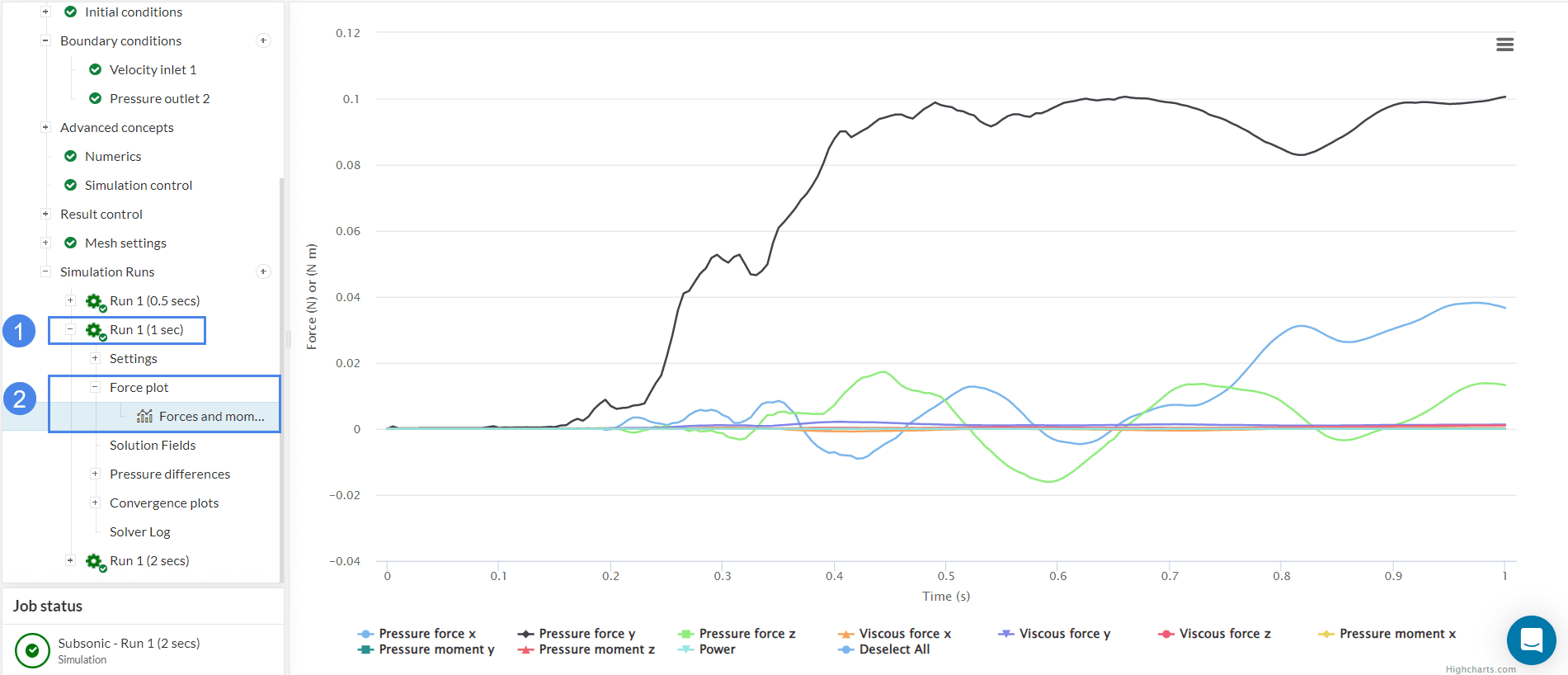 Figure 28 shows multiple runs performed with end times of 0.5, 1, and 2 seconds. For this tutorial purposes (end time of 1 second) the curves seem to be still fluctuating and more time steps might be required until a predictable pattern is observed.