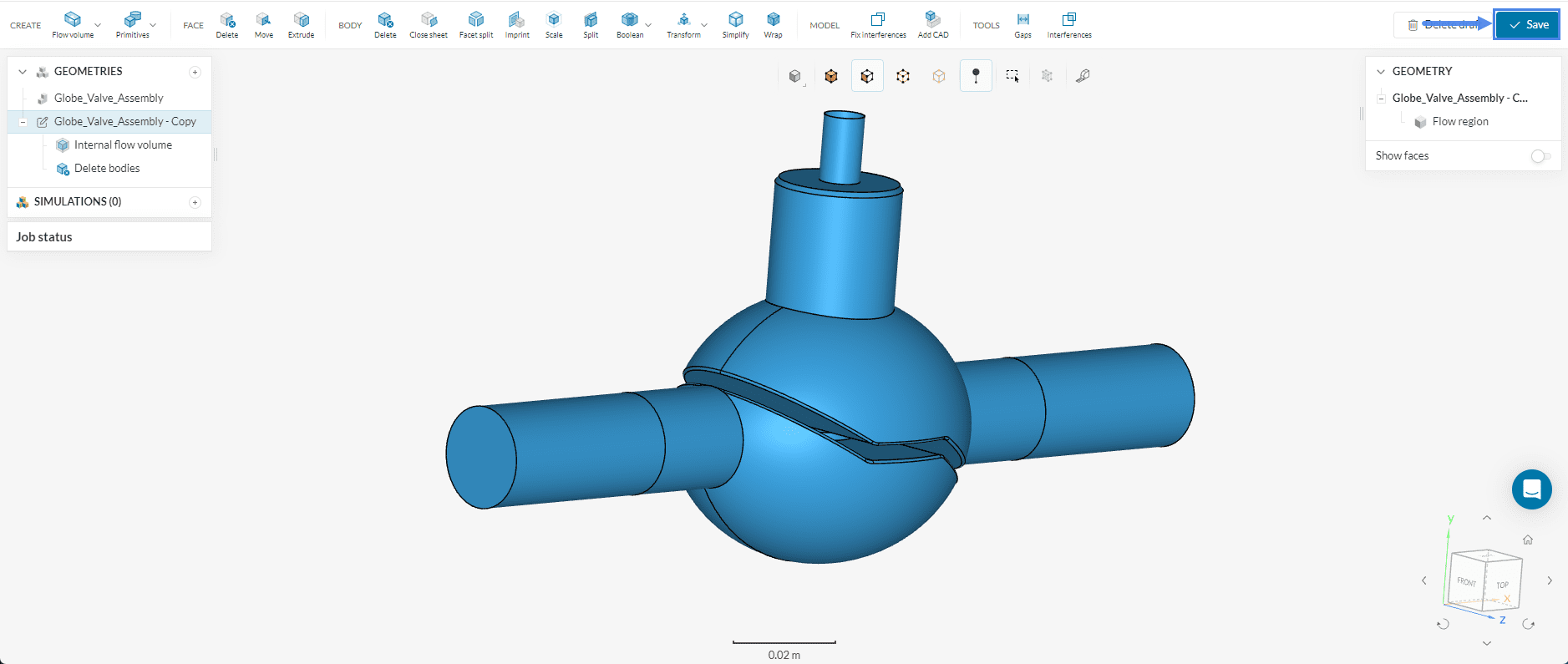 The user will be left with only the flow region. Use the ‘Save’ button to use this new geometry.