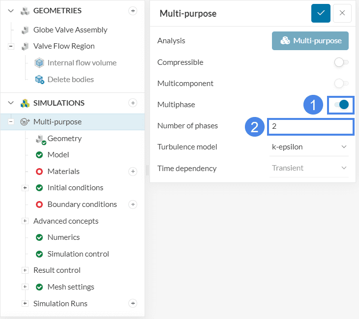 The global simulation settings will be adjusted for Time dependency to ‘Transient’ and the Toggle ‘Multiphase’ as in Figure 9. This is the only way a multiphase analysis can be performed.
