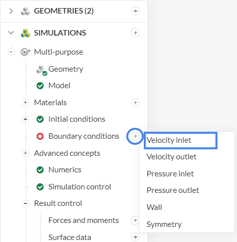 Click on the ‘+ button’ next to boundary conditions. A drop-down menu will appear, where one can choose between different boundary conditions.