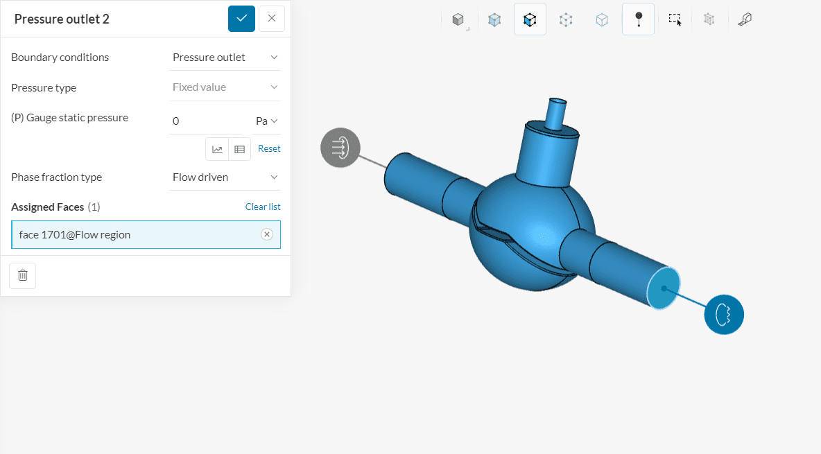 Create a new boundary condition, this time a ‘Pressure outlet’, and select the outlet face. Make sure (P) Gauge Pressure is set to a fixed value of ‘0’ \(Pa\).