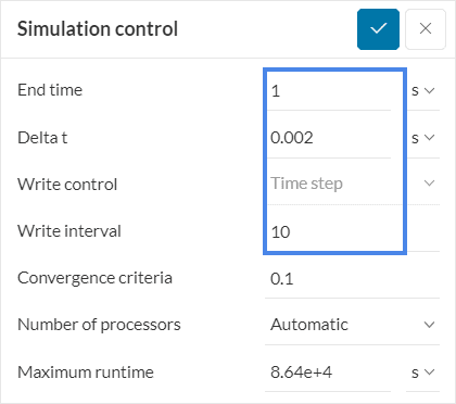 Don’t worry about the numerical settings for this simulation, as their default values are optimized. Open the simulation control settings and change the following: