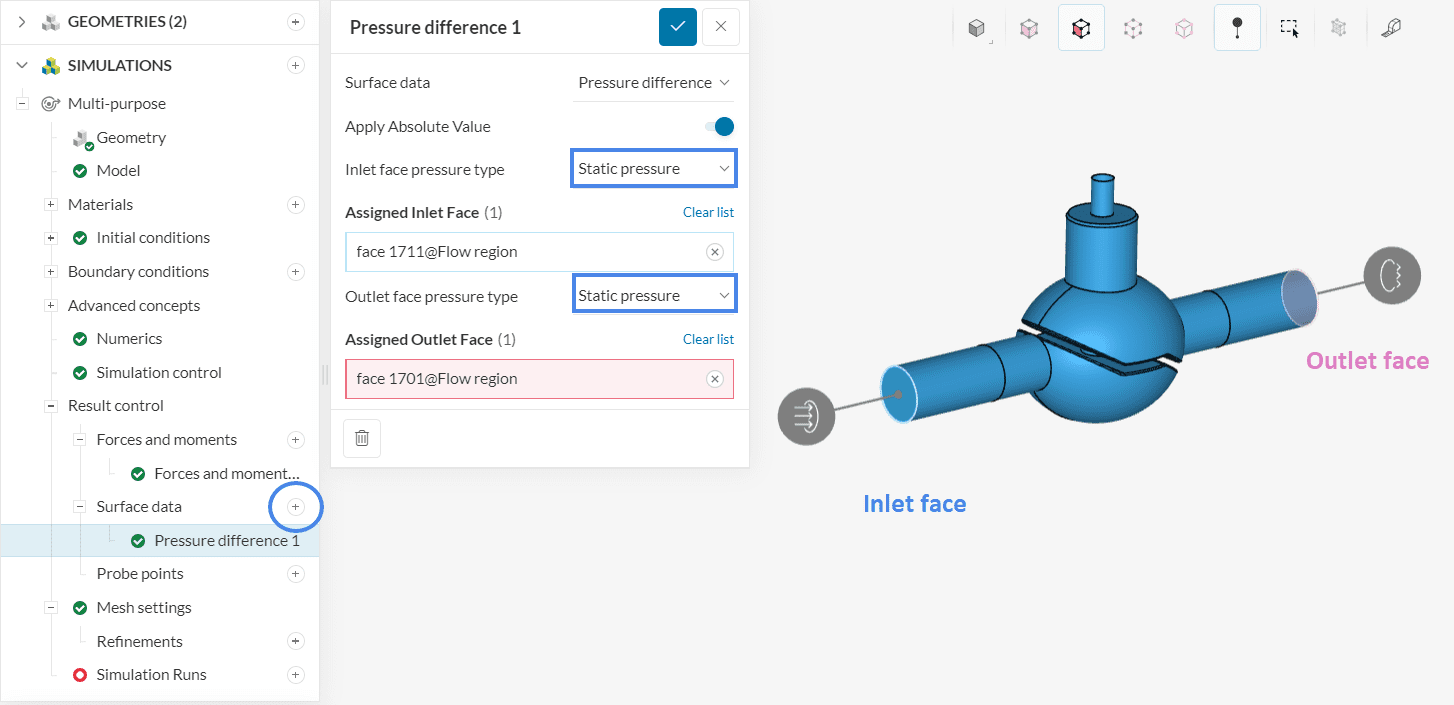 For this simulation, please set a ‘Forces and moments’ control on the “plug” of the valve. Click on the ‘+’ icon under Result control> Forces and moments to open the settings panel as shown below: