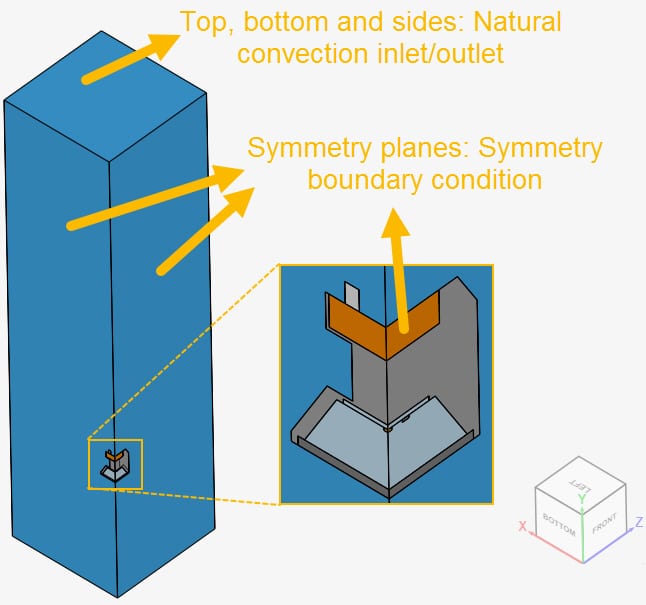 Using figure 23 as a reference, the top, bottom, and both side faces will receive a natural convection inlet/outlet boundary condition.
