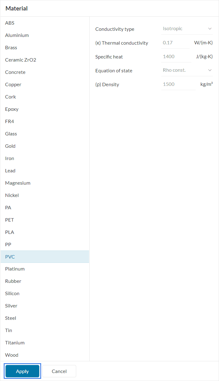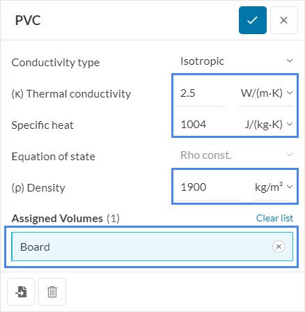 The materials library contains common properties for PVC. In this tutorial, PVC is used in a circuit board, so we will adjust the material properties to account for the circuits. Figure 17 shows the changes: