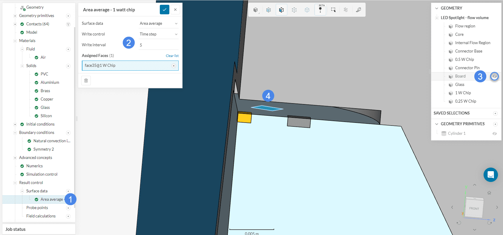 For a LED simulation, some parameters of interest are, for example, the temperature on the chips. Therefore, we will set Area average result controls on them. To do that, please proceed as in Figure 31: