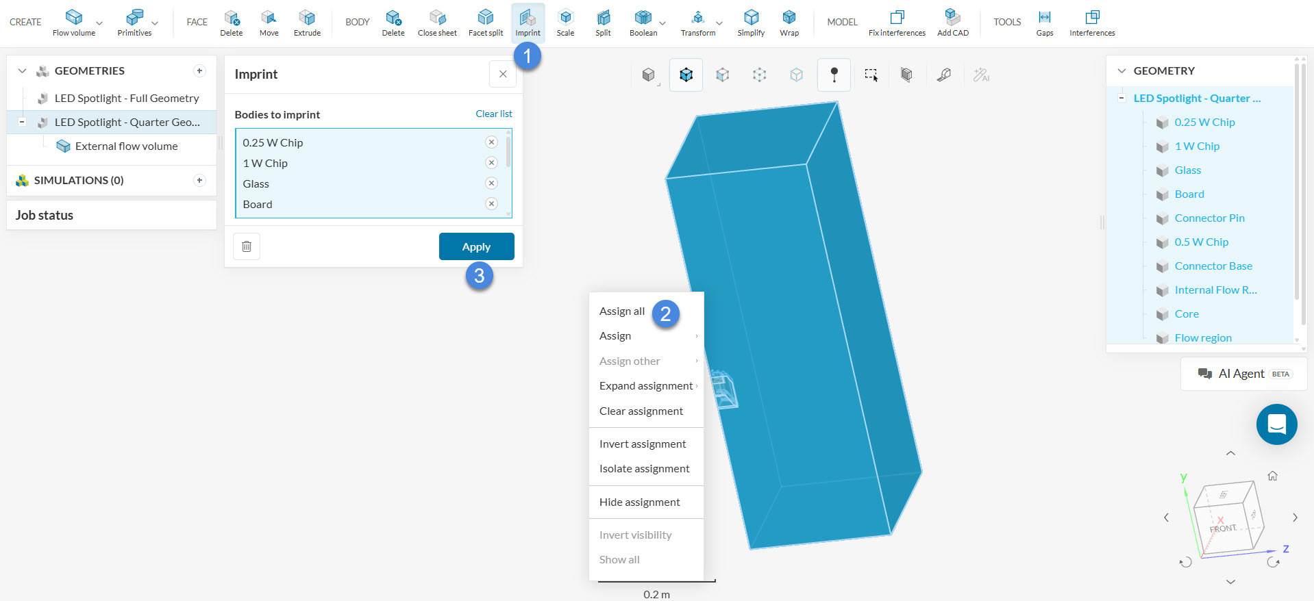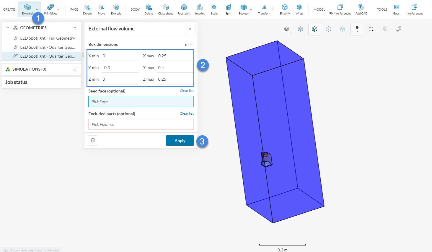 The initial CAD geometry only contains the LED spotlight parts. Before starting to work on the setup, we have to create the external flow volume, and also imprint the geometry.
