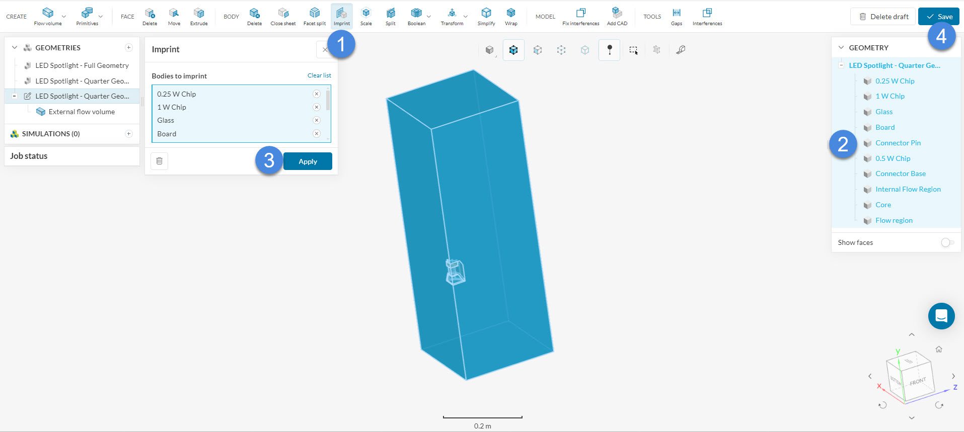 Once you finish running the imprint operation, please make sure to click on ‘Save’. This will save the latest version of your draft as a new model under the Geometries list.