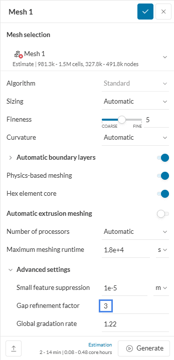 After clicking on Mesh in the simulation tree, a setup window opens. The main default settings are good for an initial study. Under Advanced settings, please set the Gap refinement factor to ‘3’.