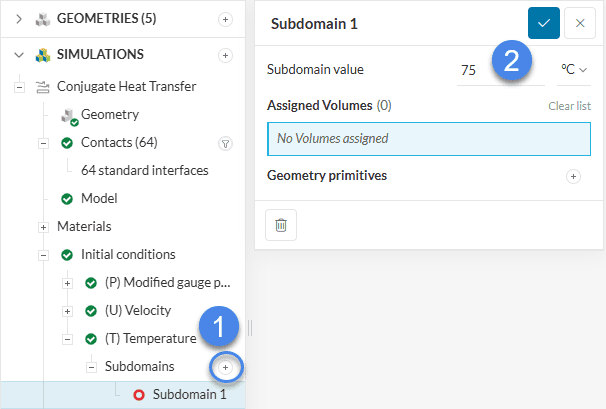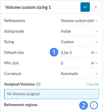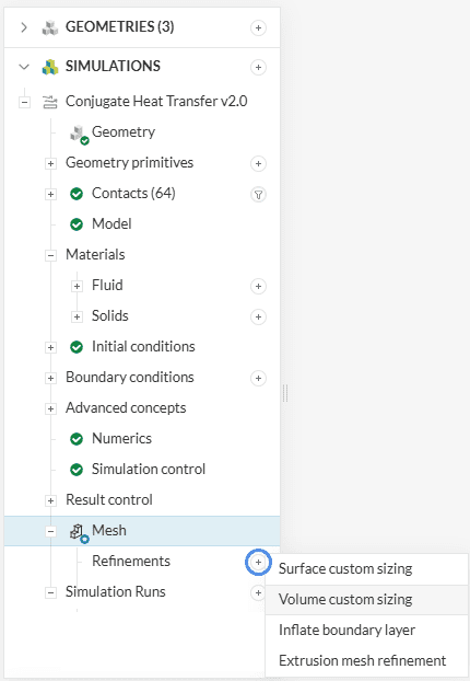 With the standard mesher, a volume custom sizing is appropriate to capture the developing plume. Therefore, please click on the ‘+ button’ next to Refinements: