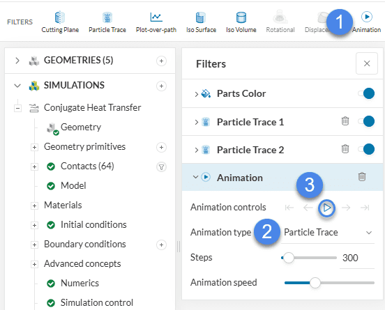 After pressing the play button (step 3 in the image above), we can see how the particles travel through the domain in the animation: