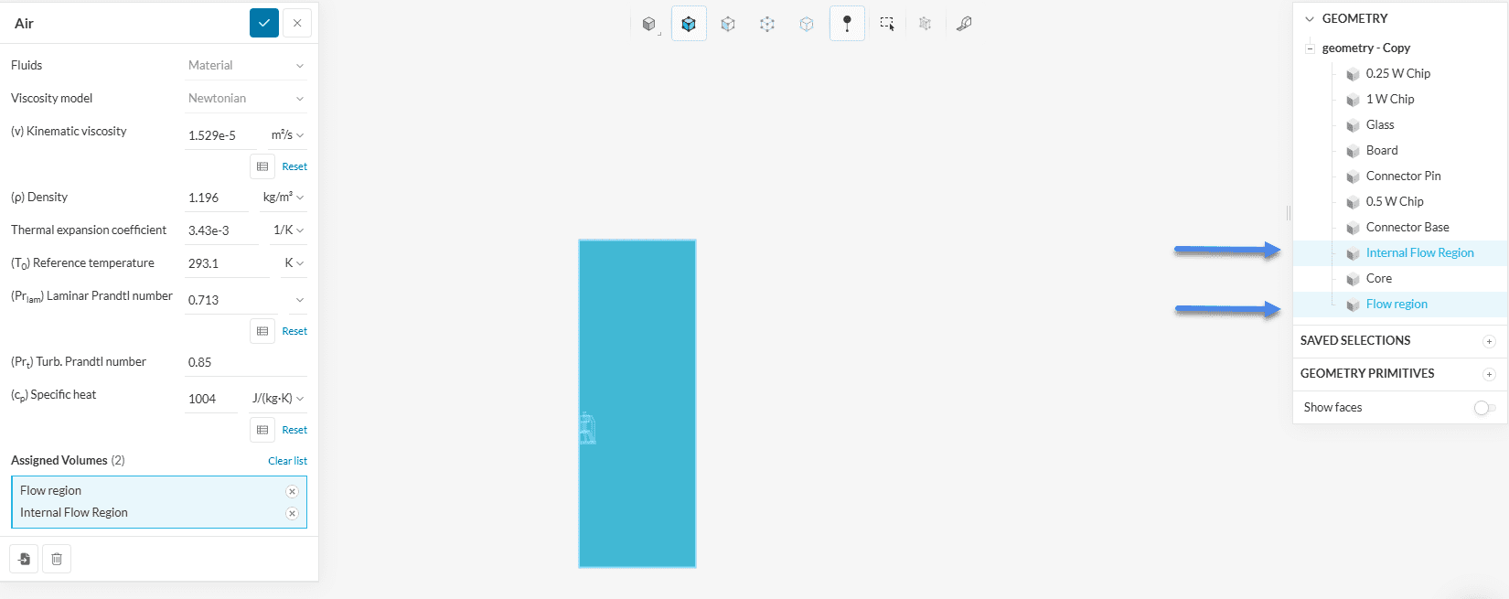 The geometry contains two air regions: one internal to the LED, and the external flow region. You can use the right-hand side panel to quickly select the volumes.