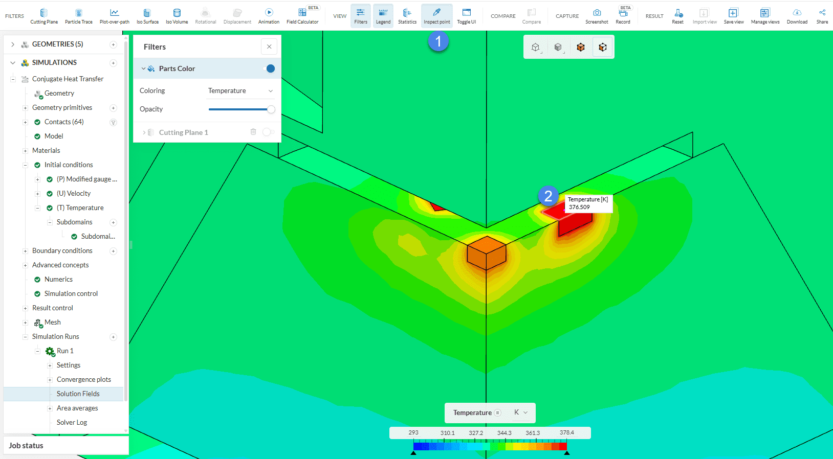 For electronics cooling applications, it is useful to visually evaluate the temperature on and around the chips. After accessing the post-processor by clicking on ‘Solution Fields‘, please proceed as below: