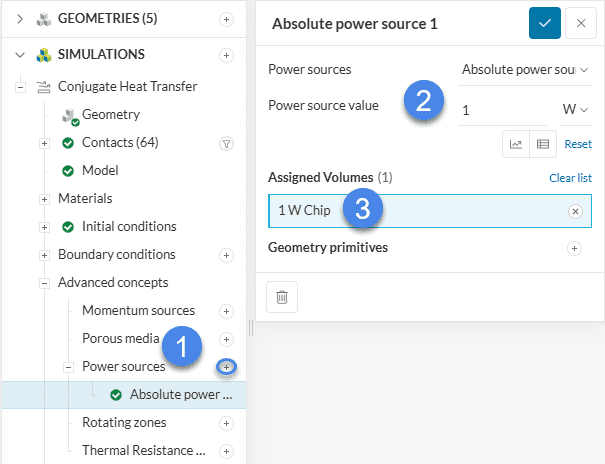 Please create two new power sources, for the 0.5 W Chip and the 0.25 W Chip volumes. Follow the same steps outlined above, remembering to adjust the Heat flux accordingly.