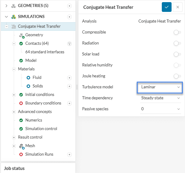 The global simulation settings are shown in Figure 11. Since it’s a natural convection simulation, the velocities in the domain are small, and a ‘Laminar’ turbulence model is appropriate.