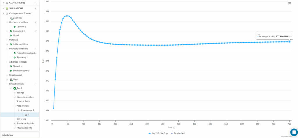 Before heading over to the post-processing environment, let’s inspect the data obtained with the result controls. The average chip temperatures are available under the ‘Area averages’ tab: