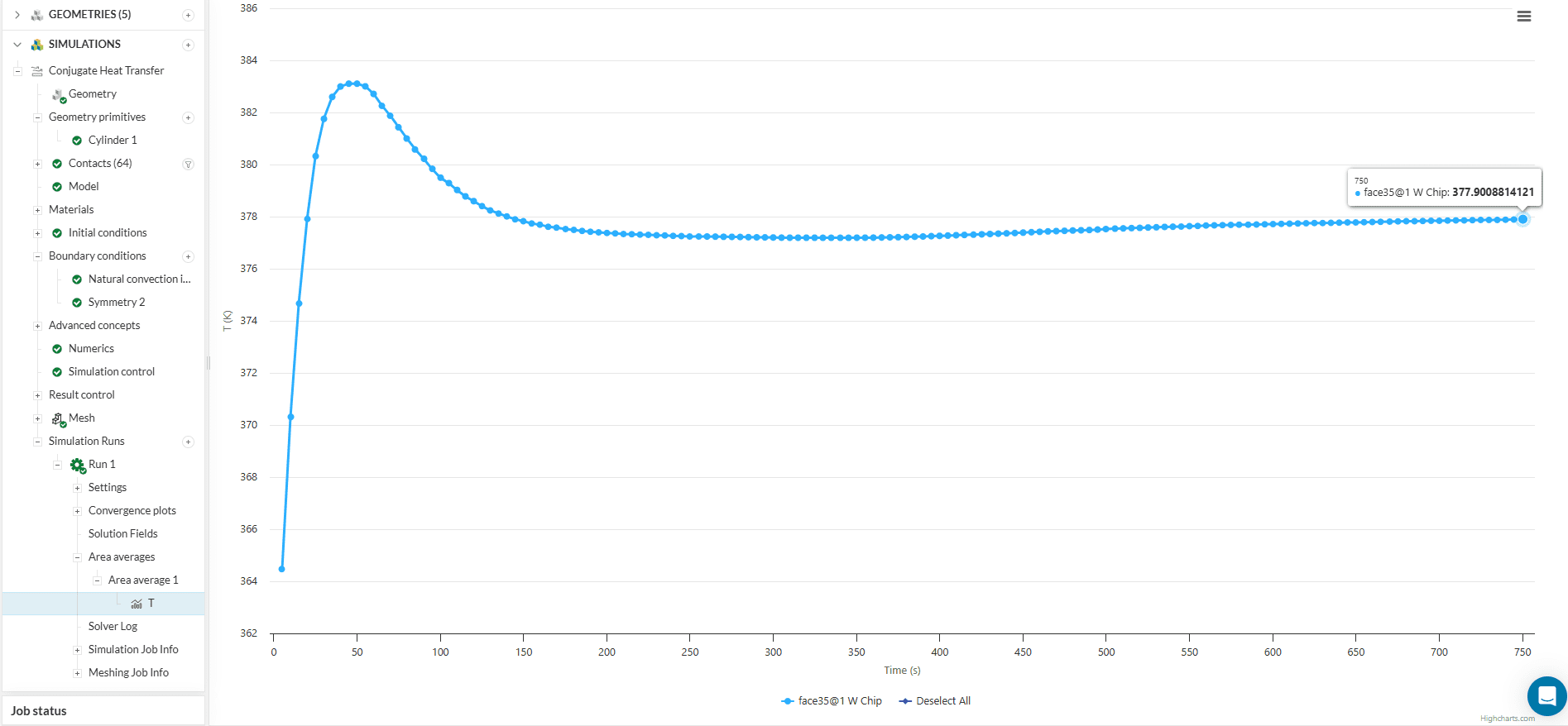 The plot shows how the chip temperature is evolving as the algorithm performs iterations. In a converged simulation, the temperatures will stabilize and no longer change between iterations. As a result of the strongly coupled formulation from the CHT algorithm, the temperature converges quickly, in just over 300 iterations.