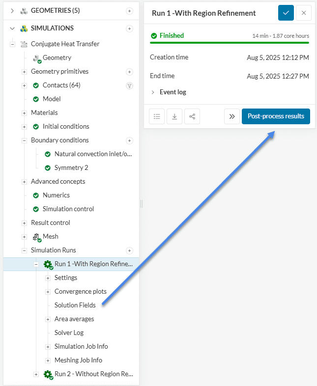 The simulation run takes from 1 to 2 hours to finish. At this point, you can access the post-processing environment by clicking on ‘Solution Fields’ or ‘Post-process results’: