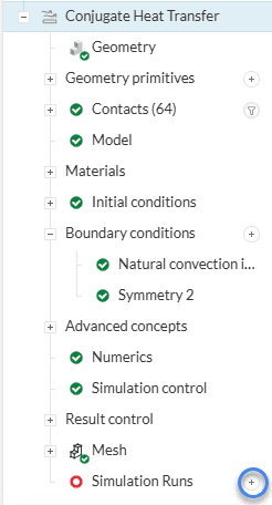 After creating a simulation, the simulation tree will be visible in the left-hand side panel. It’s necessary to set up all entries to be able to run the simulation. At this point, SimScale will also automatically detect all Contacts within the geometry. In our case, there are a total of 64 interfaces.