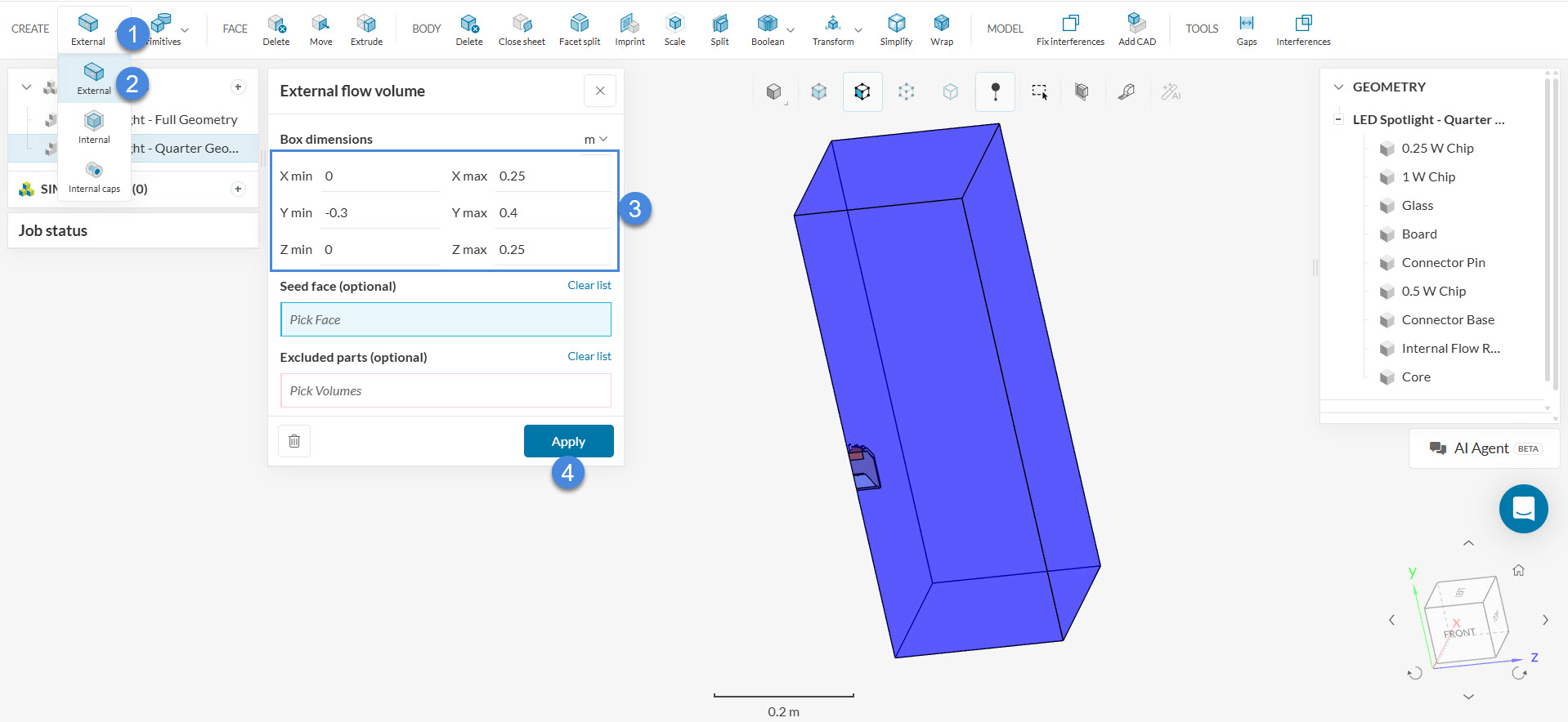 It’s possible to use the symmetrical nature of the LED spotlight geometry in our favor. Since we expect the flow to be mirrored along the symmetry planes, we can use just a quarter of the geometry. This brings a series of benefits, such as: