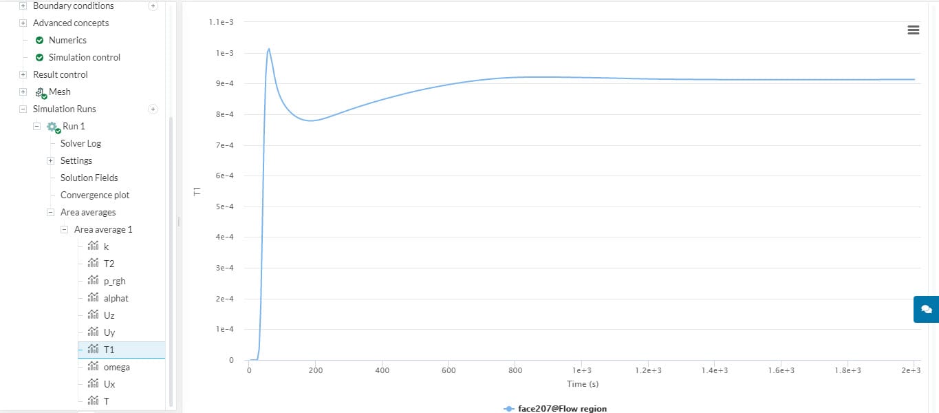 Once the run is finished for your smoke propagation simulation, open the area average at the outlet result control. For steady-state simulations, the parameters are expected to converge and stabilize as iterations go on. Let’s inspect the average level of the first passive scalar (identified as T1):