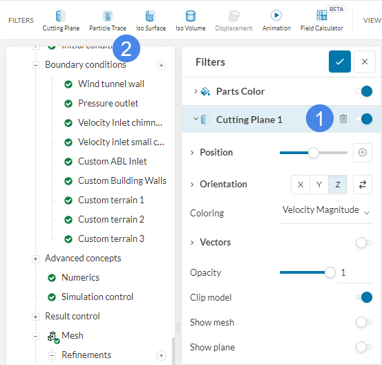 Next, let’s utilize a cutting plane generated by default to observe how the smoke propagation, or gas coming out of the chimneys, affects the temperature of the surroundings. Toggle the ‘Cutting Plane’ on and the ‘Particle Traces’ off. Set up the settings of the cutting plane by following the step below: