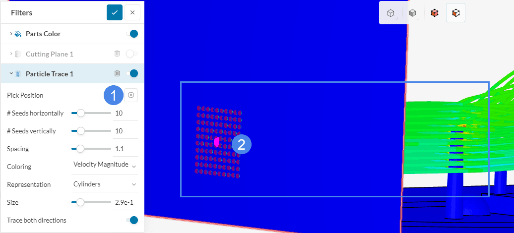 The first post-processor filter that we will use is the ‘Particle Trace’ filter. This filter is very useful to know how the chimneys affect the airflow in the fluid domain. Please follow the steps below to visualize the particle traces: