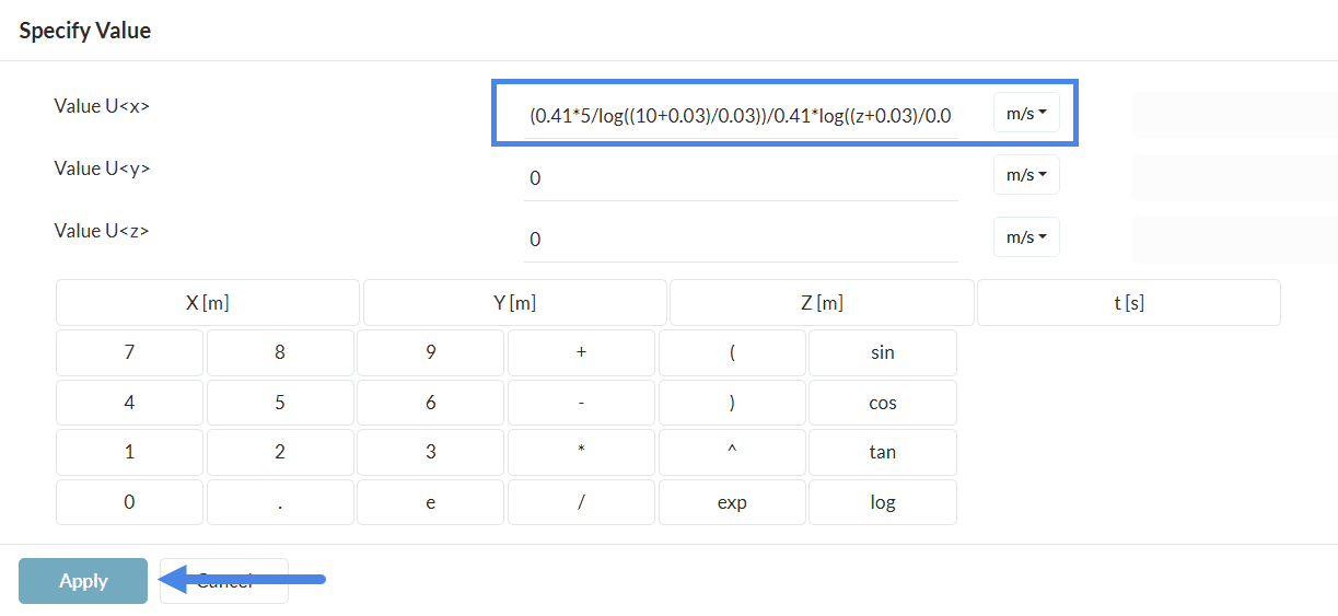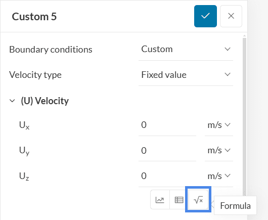 Afterward, two tabs will be available: Formula and Table. Switch to the formula input, and paste the velocity formula posted above in the x-direction. Hit ‘Apply’ to save.