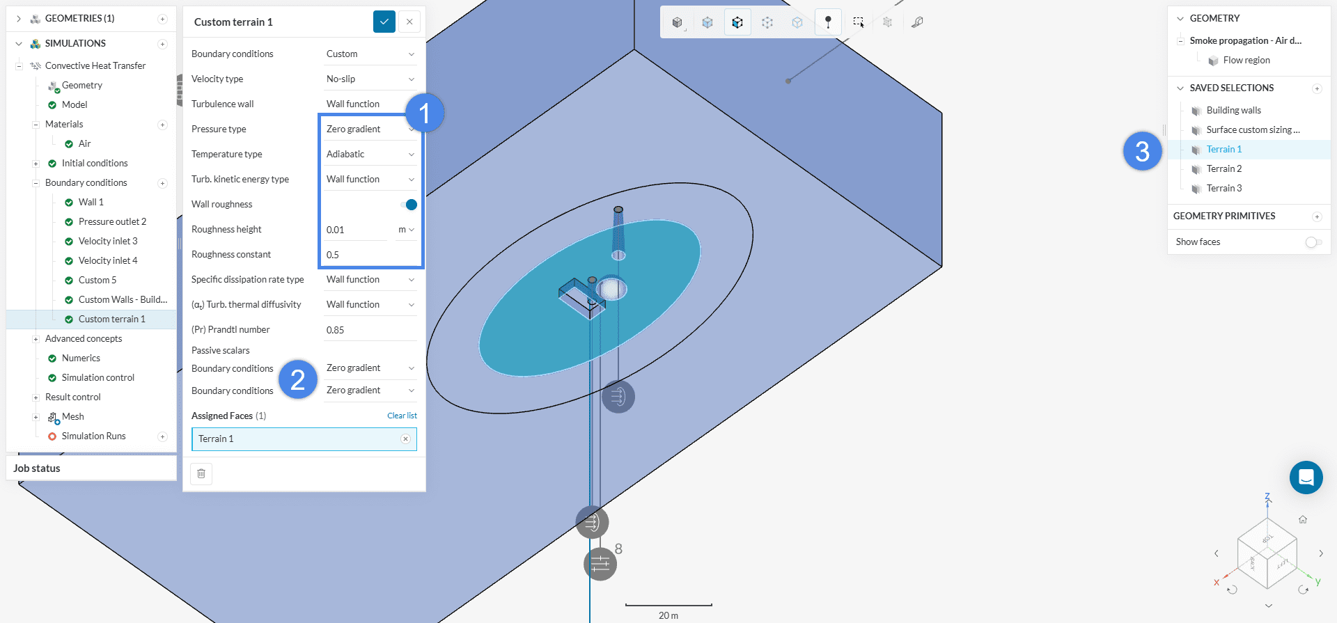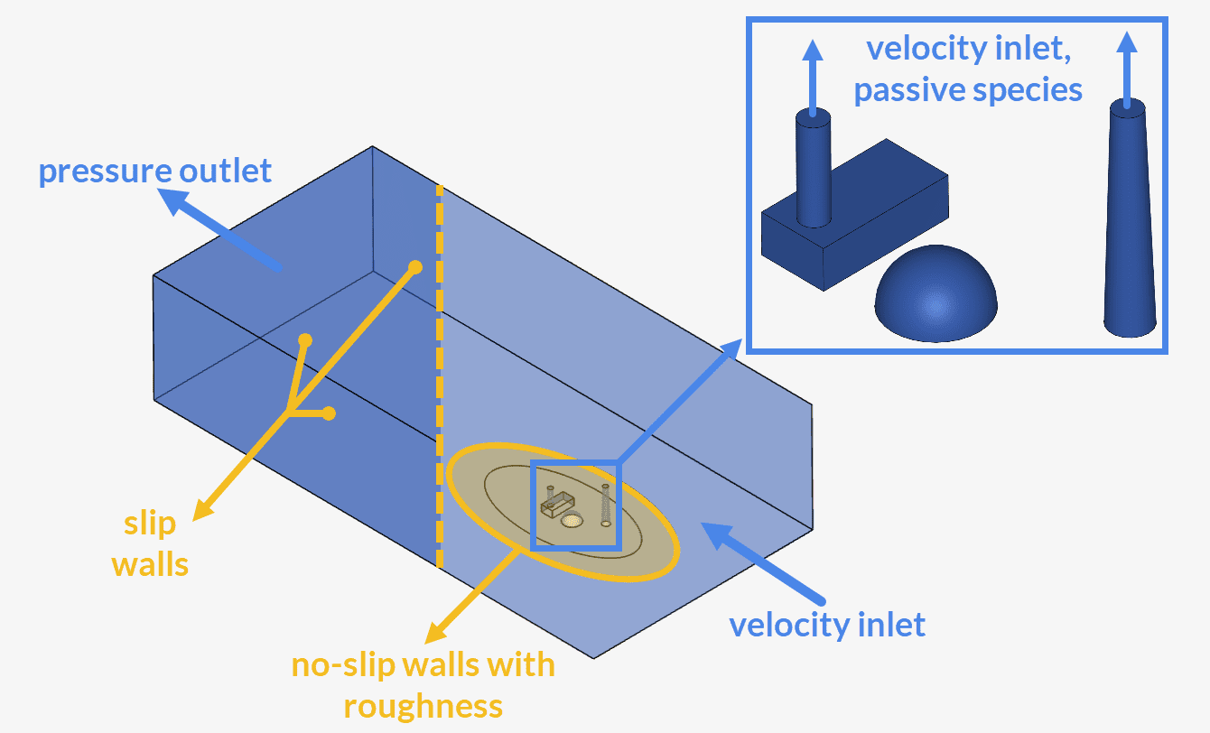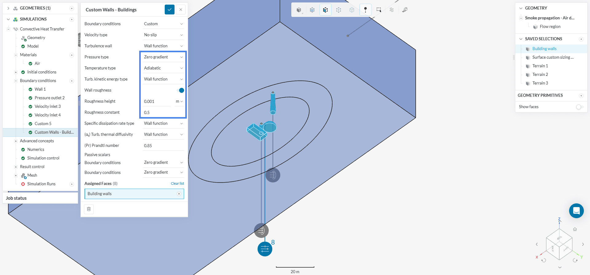 Solid walls will receive a no-slip condition. Furthermore, we can specify a surface roughness for the building walls, as well as for the terrains. For more information about the surface roughness model, check the relevant documentation.