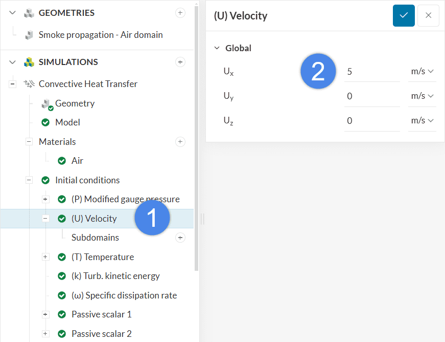 To enhance convergence, please initialize the velocity field with ‘5’ \(m/s\) in the x-direction. This velocity represents \(u_{ref}\):
