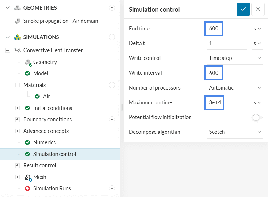 In Simulation control, change the End Time and the Write interval to ‘600’. Furthermore, please adjust the Maximum runtime to ‘30000’ seconds.