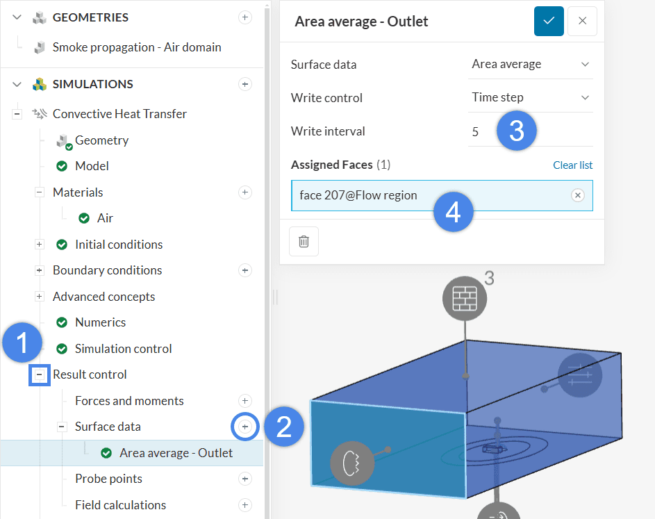 For this simulation, set up an Area average result control on the outlet. Please proceed as below: