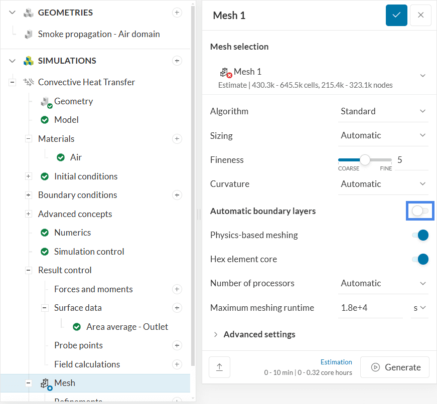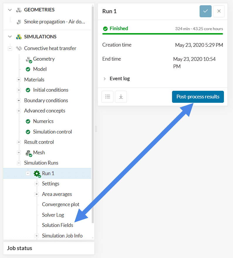 The entire smoke propagation simulation takes around 100 minutes to finish. In the reference project, which is linked below, we calculated a few more iterations, to assure complete convergence.