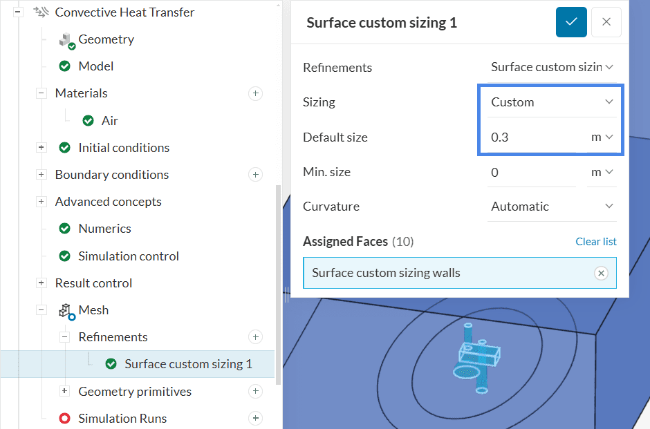 Finally, assign this cartesian box to the Volume custom sizing refinement. This step finalizes the setup of the simulation.