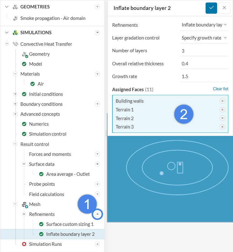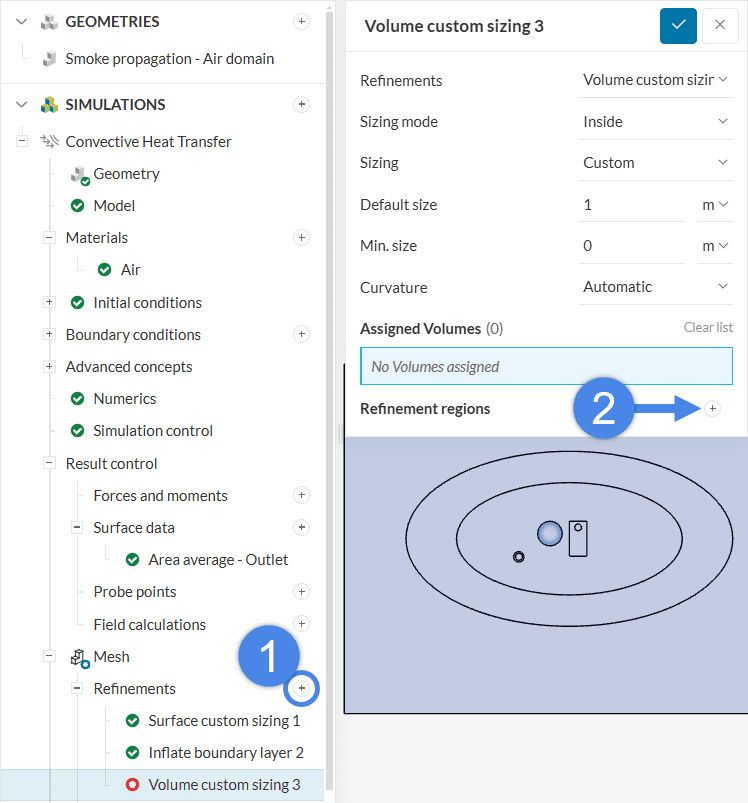 Click on the ‘+ button’ next to Refinements. The first refinement is Surface custom sizing. This refinement limits the maximum edge length of cells in chosen entities. Hence, it’s useful to improve the resolution in specific regions.