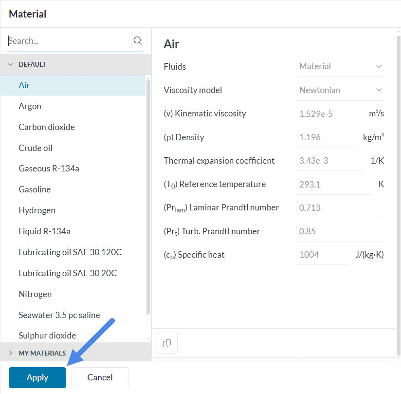 This simulation will use ‘Air’ as fluid material. Therefore click on the ‘+ button’ next to Materials. In doing so, a library of fluid materials opens: