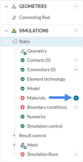 To assign a material to your model, click on the ‘+’ button next to Materials in the simulation tree.