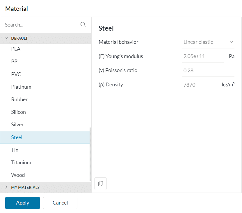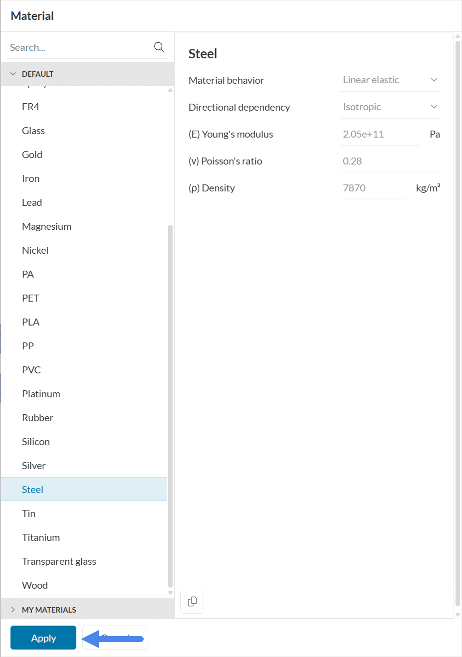 The Material library will open containing pre-defined materials. Scroll down to select ‘Steel’ and click ‘Apply’.