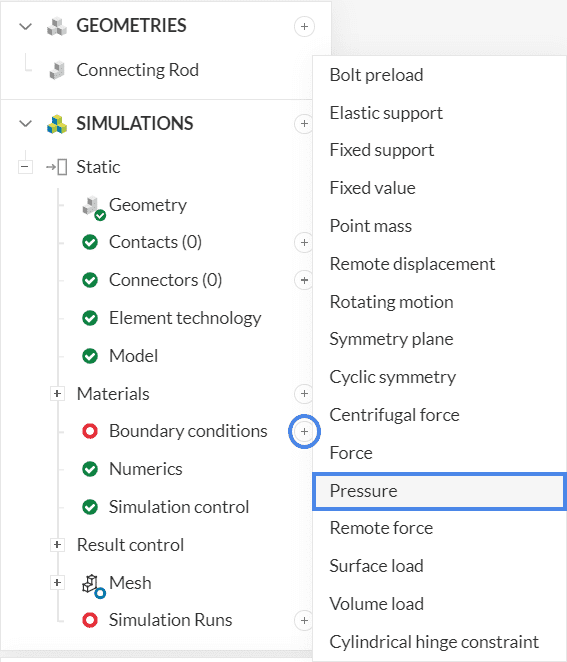 To create a new boundary condition, click on the ‘+’ button next to Boundary conditions in the simulation tree. Select ‘Pressure’ from the list.
