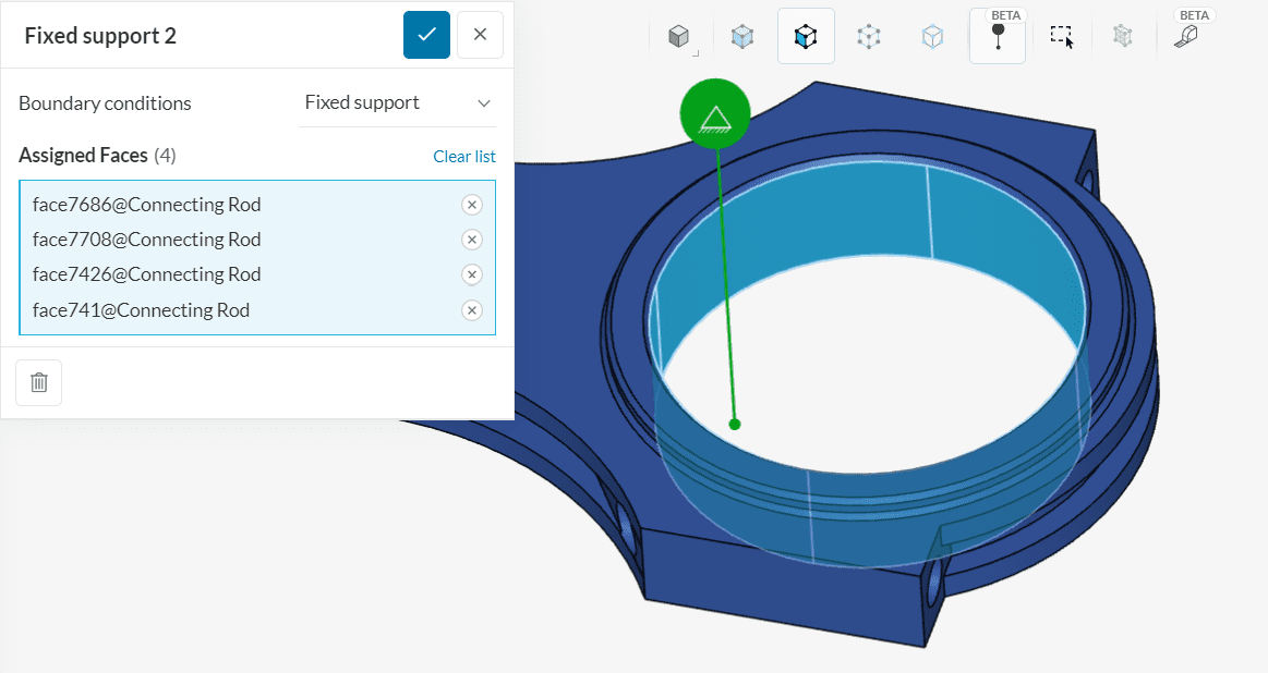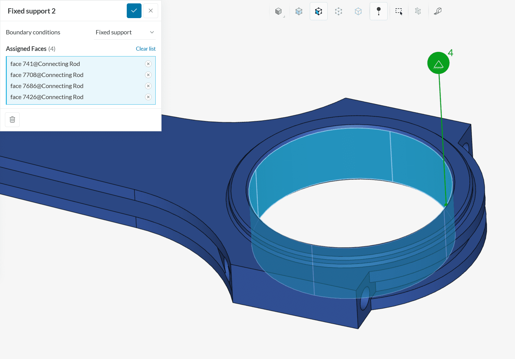 Repeat the process and add another boundary condition by clicking on the ‘+’ button next to Boundary conditions. Select ‘Fixed Support’. Assign all the inner faces at the larger end of the connecting rod in the viewer.
