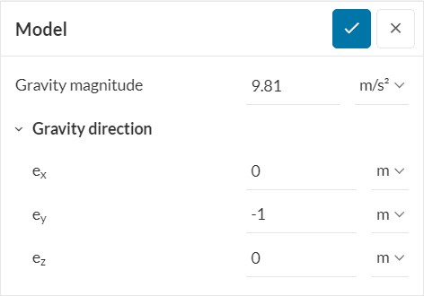 This will open up the settings panel for Model. In this case, gravity is acting in the negative y-direction. Add ‘9.81’ m/s as the magnitude and ey as ‘-1’ to indicate gravity in the negative-y direction.