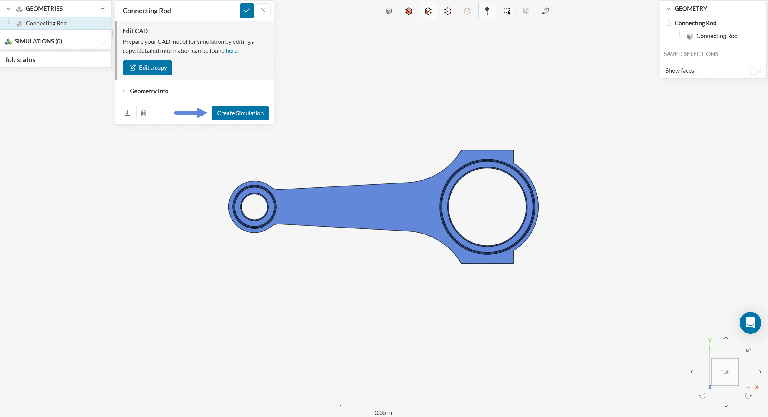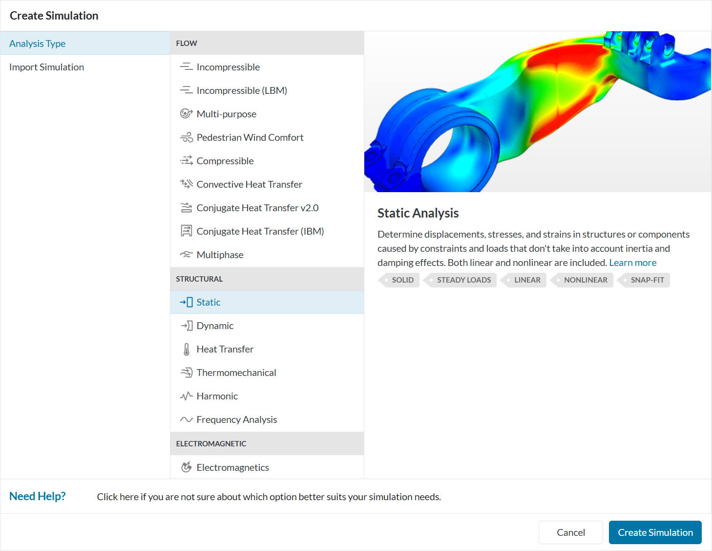 To begin the simulation setup, use the ‘Create Simulation’ button located in the geometry dialog box. This opens the simulation creation panel where analysis types can be selected.